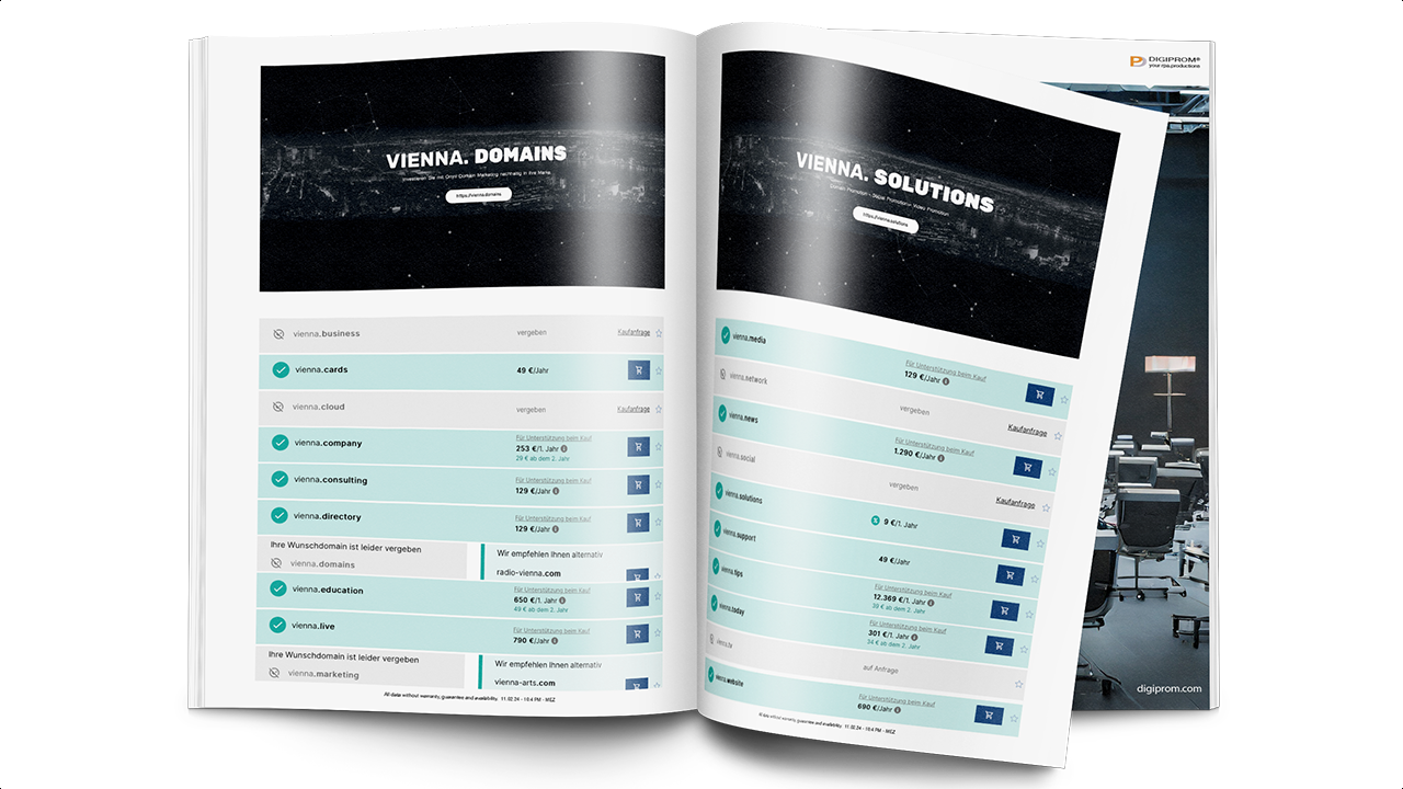 Combine your new registred TLD´s, build and operate the vienna.network. Become a partner and start with the DigiProm® Solutions. Be one of the first by offering fixed placed fullscreen live marketing advertorials for 365 day promotion and relevant search entries.